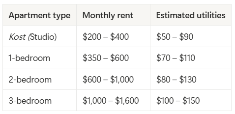 Expect older apartments, basic guesthouses, and small kosts. It’s ideal if you’re on a budget or just starting out.