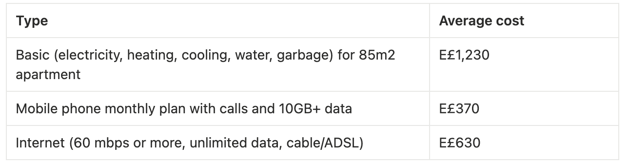 Electricity, water, heating, cooling, and waste services for an average apartment typically cost around E£1,200 to E£1,500 per month.