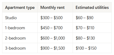 • Average monthly cost for a 1–2 bedroom apartment: $35–65