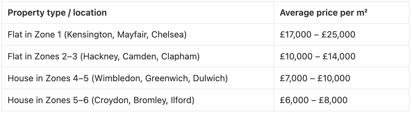 Moving outward makes a dramatic difference. In Zones 3 - 4 (Wimbledon, Greenwich, or Hackney), average prices fall to £9,000 – £12,000 per square metre, while in Zones 5 - 6 (Croydon, Bromley, or Ilford), you’ll find newer builds or family houses for £6,000 - £8,000 per square metre. However, commuting costs tend to increase, so it’s a trade-off between affordability and convenience.
