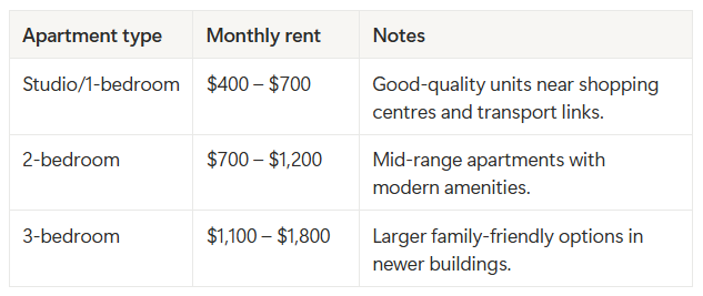 • Average monthly cost for a 1–2 bedroom apartment: $60–120