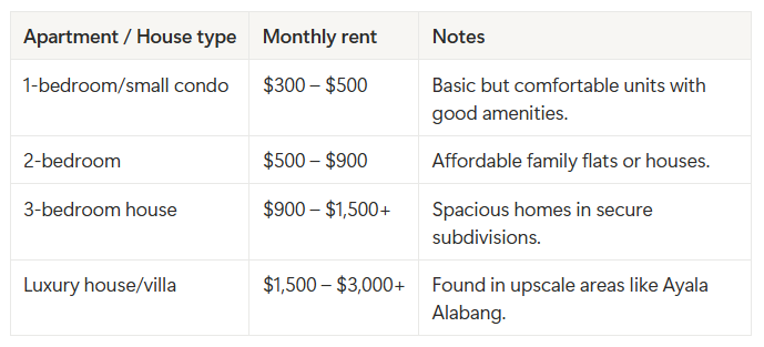 Rents vary depending on the neighbourhood, proximity to business hubs like Makati or BGC, and whether your apartment is furnished or includes utilities. Modern condos tend to cost more, but they come with great amenities like pools, gyms, and 24-hour security.