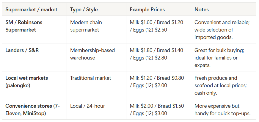 Grocery prices in Manila vary depending on where you shop. Local palengkes (wet markets) are the cheapest for fresh produce, while supermarkets like SM or Robinsons offer convenience and imported goods at higher prices.