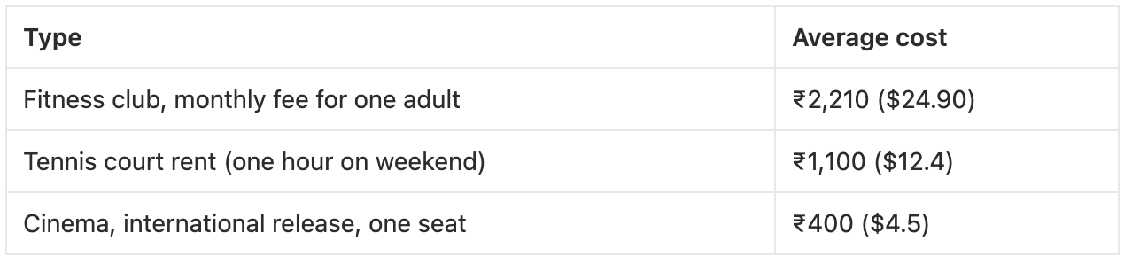If staying active is a priority, you’ll find a wide range of fitness options across the city. Basic gym memberships in local neighbourhoods start around ₹1,200 - ₹2,500 per month, while premium chains like Gold’s Gym, Cult.Fit or Fitness First charge between ₹3,000 - ₹6,000 monthly.