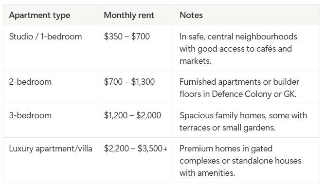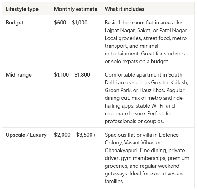 You can live comfortably in New Delhi for around $1,200–1,600 per month, though costs rise sharply in high-end neighbourhoods or if you prefer imported goods and Western-style amenities.