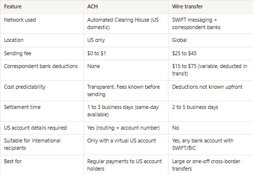 For US clients, wire transfers are often used for large transactions, with higher fees accepted as a cost of doing business. For regular freelance or consulting payments of $1,000 to $5,000, wire transfers are rarely the better choice when ACH is available.